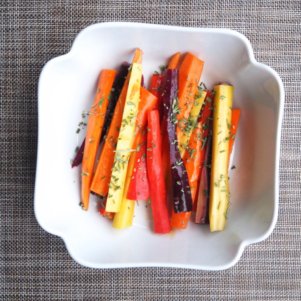 Pour honey, olive oil and rosemary over the carrots and mix well so all the carrots are covered.