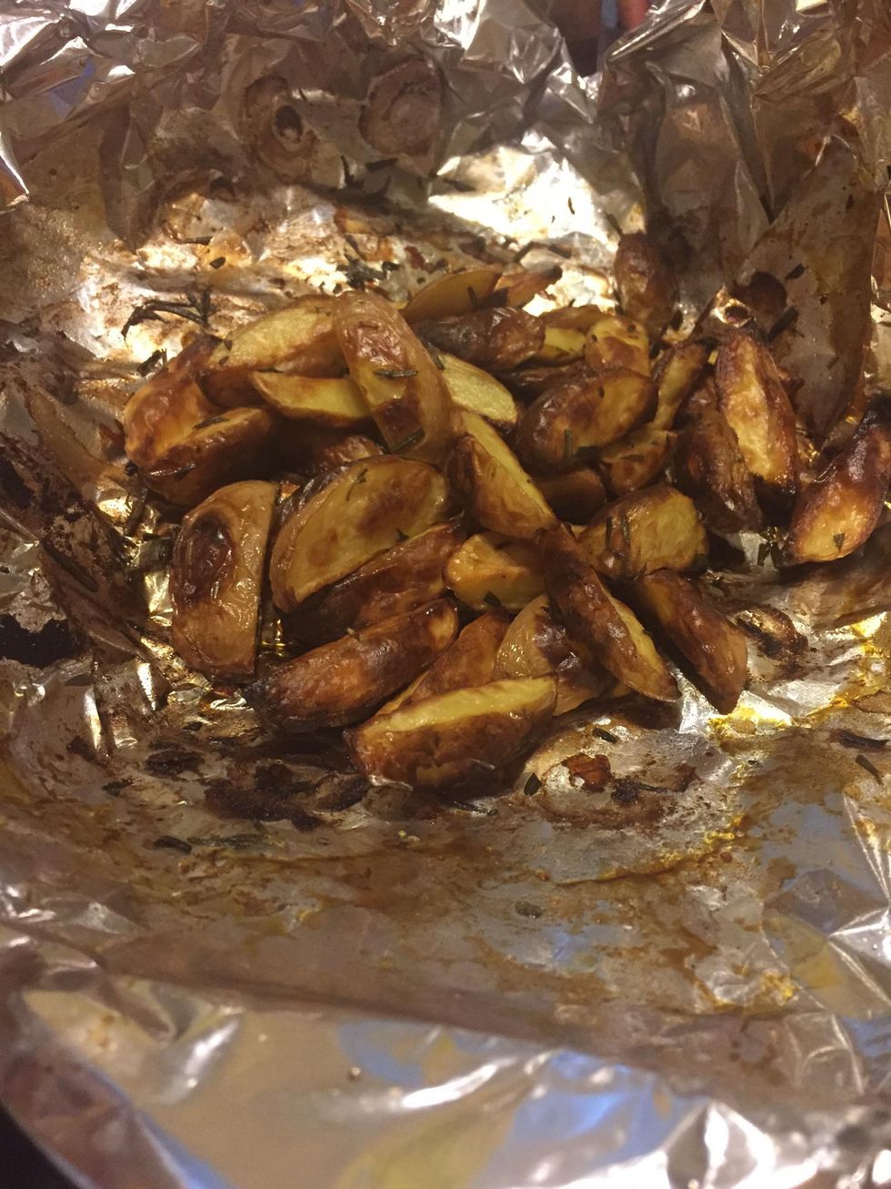 Cover an oven tray with a sheet of aluminum foil and spread the marinated potatoes around. Bake in the preheated over for 40 minutes.