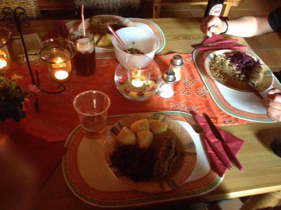 Boiled potatoes & red cabbage with this one :)