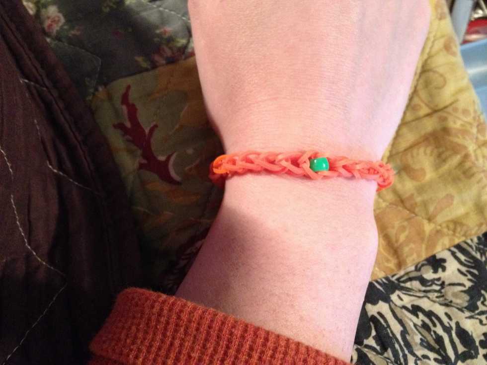 This is the completed bracelet using a single small pony bead. Be sure whatever beads you get have holes big enough to fit the elastics.