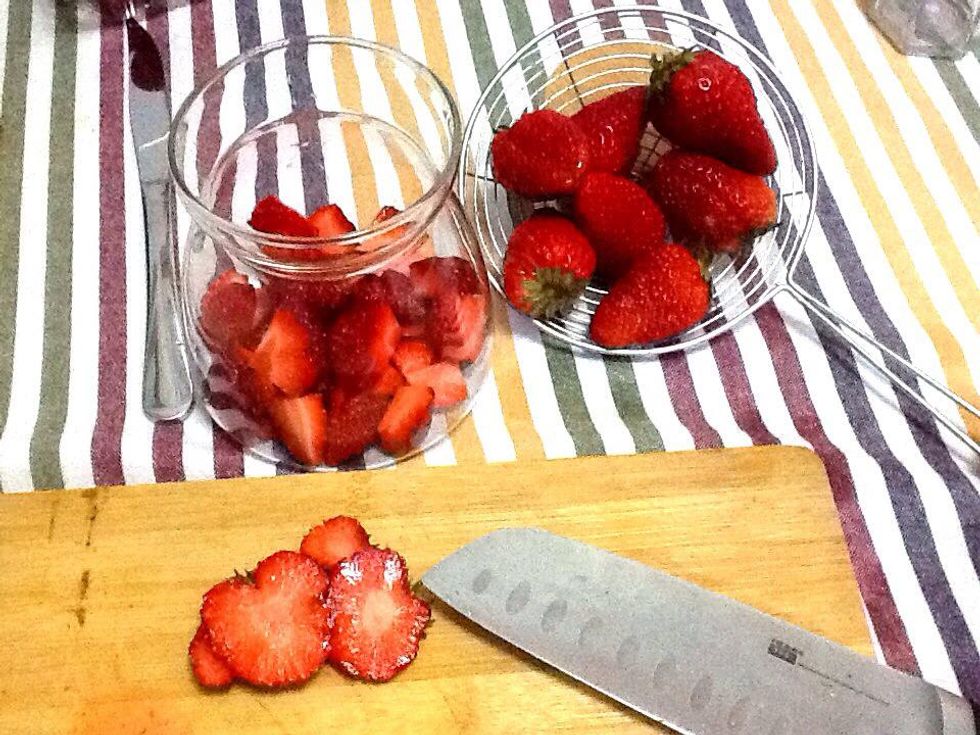 DAY 1: Wash and dry your strawberries and slice them into little pieces.