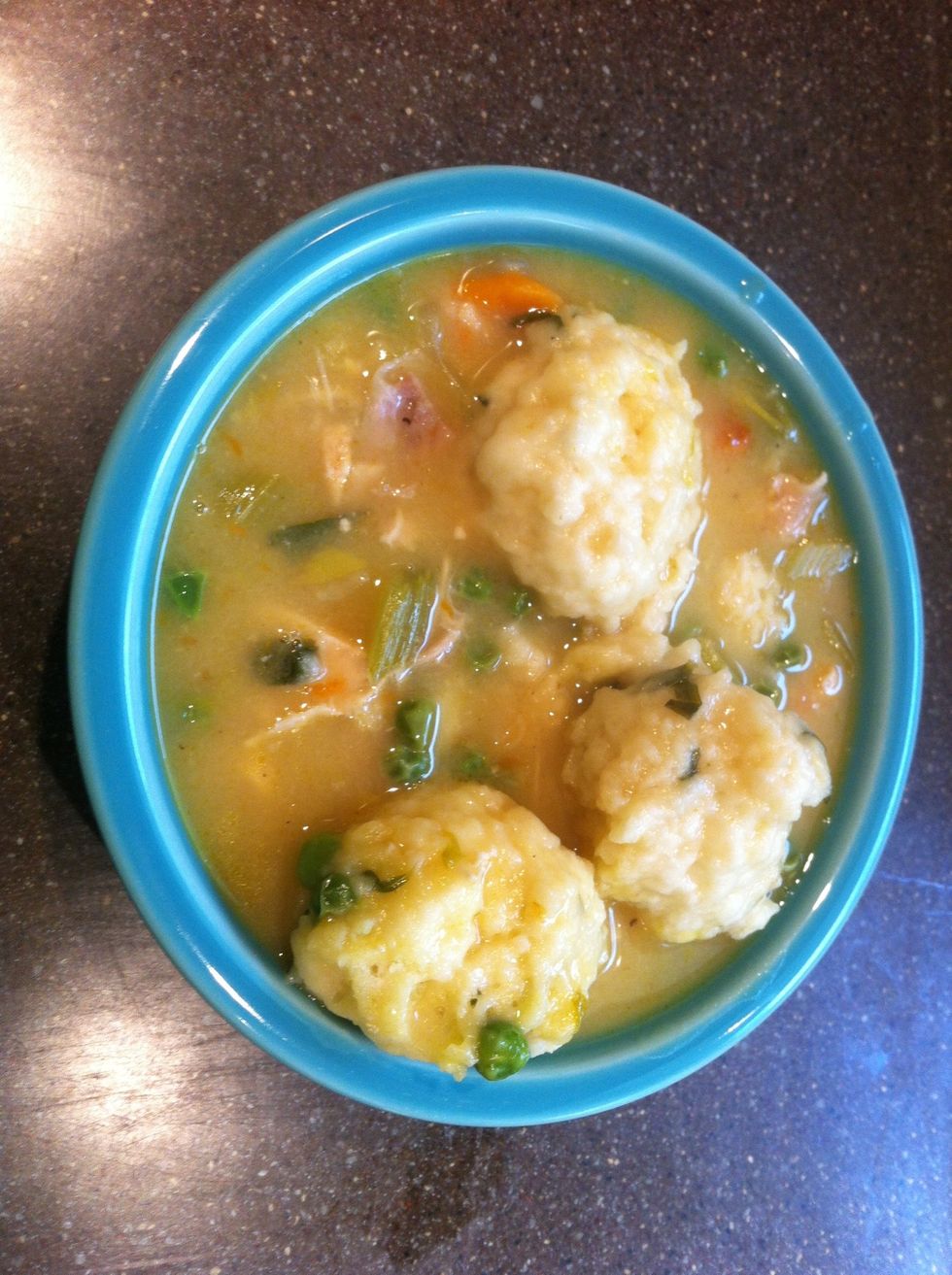 Mix 2 cups of Bisquick, 1 1/2 cups of milk, and 1/2 cup chopped fresh tarragon. Reduce heat to medium-low, Drop spoonful sized dumplings into the broth. Cook uncovered for 10 min then covered for 10.