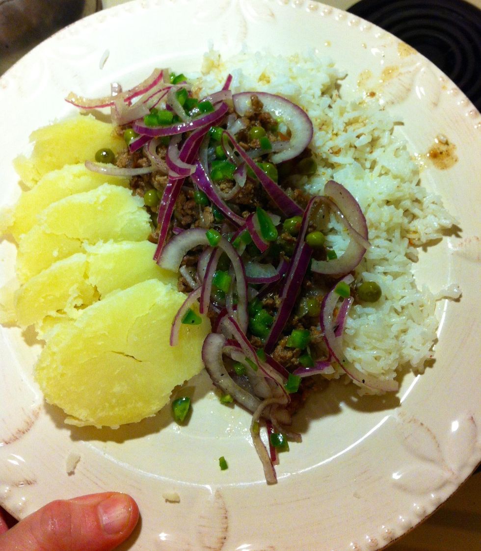 Now you're ready to combine the ingredients! I generally put the meat over the rice, then the onion sauce over the meat. The recipe I have suggests putting the meat on the potatoes. ¡Buen provecho!