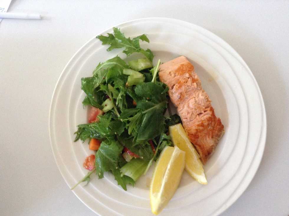 Ingredients: Lettuce Carrots Cucumber Vinegar Salmon Tomatoes Salt, Pepper, mustard, Lemon and celeryCut the carrots, Cucumeber, tomatoes and celeryFinally you can it this tasty and healthy meal