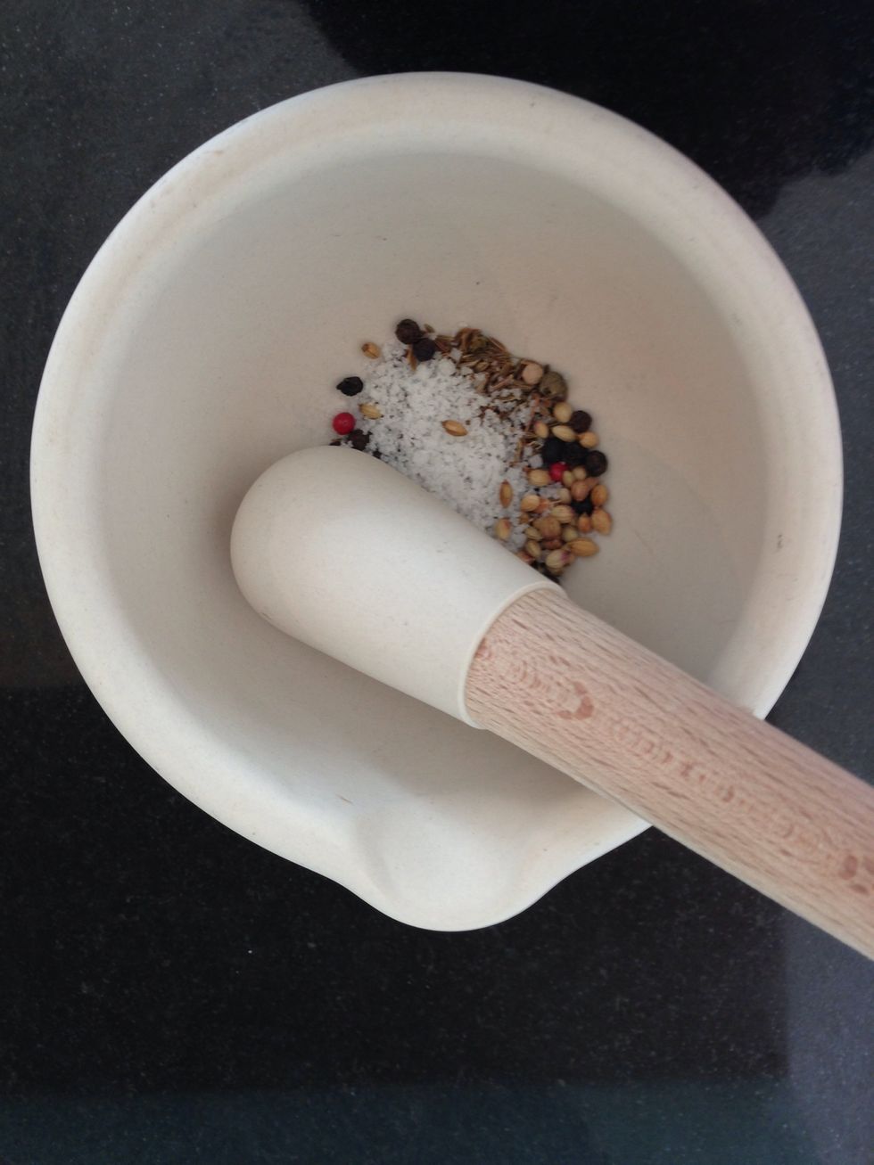 Add crushed peppercorns, coriander seeds, cumin seeds and salt