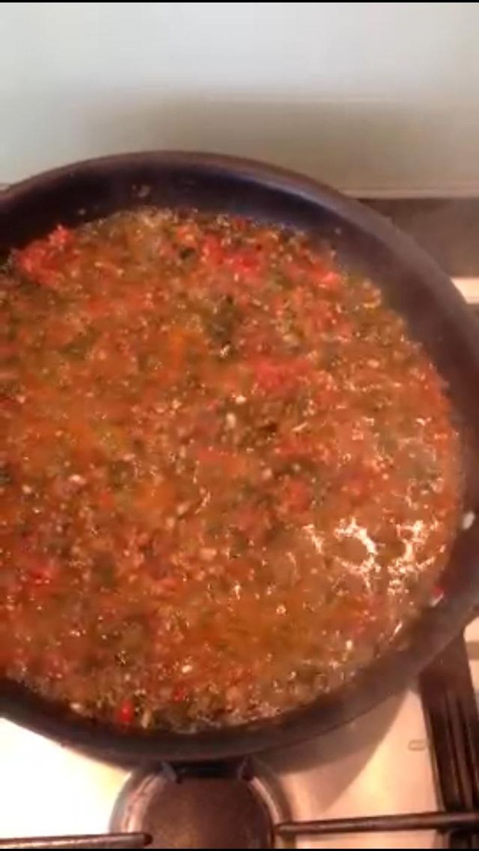 In a deep skillet, put 3-4 TBsp olive oil. Add diced onion and crushed garlic. Sweat