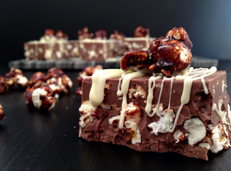 Before cutting, leave to cool completely overnight. To cut, bring chocolate to room temperature and use a heated knife if possible. Drizzle with white chocolate and decorate with popcorn pieces.