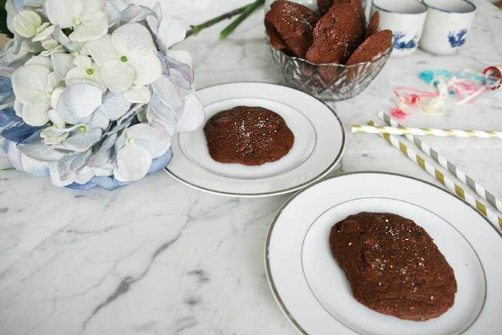 Bake for 8-10 mins. Cookies should be slightly darker brown around the outside. Remove from oven, sprinkle a little bit of sea salt on top of each cookie and leave to cool.