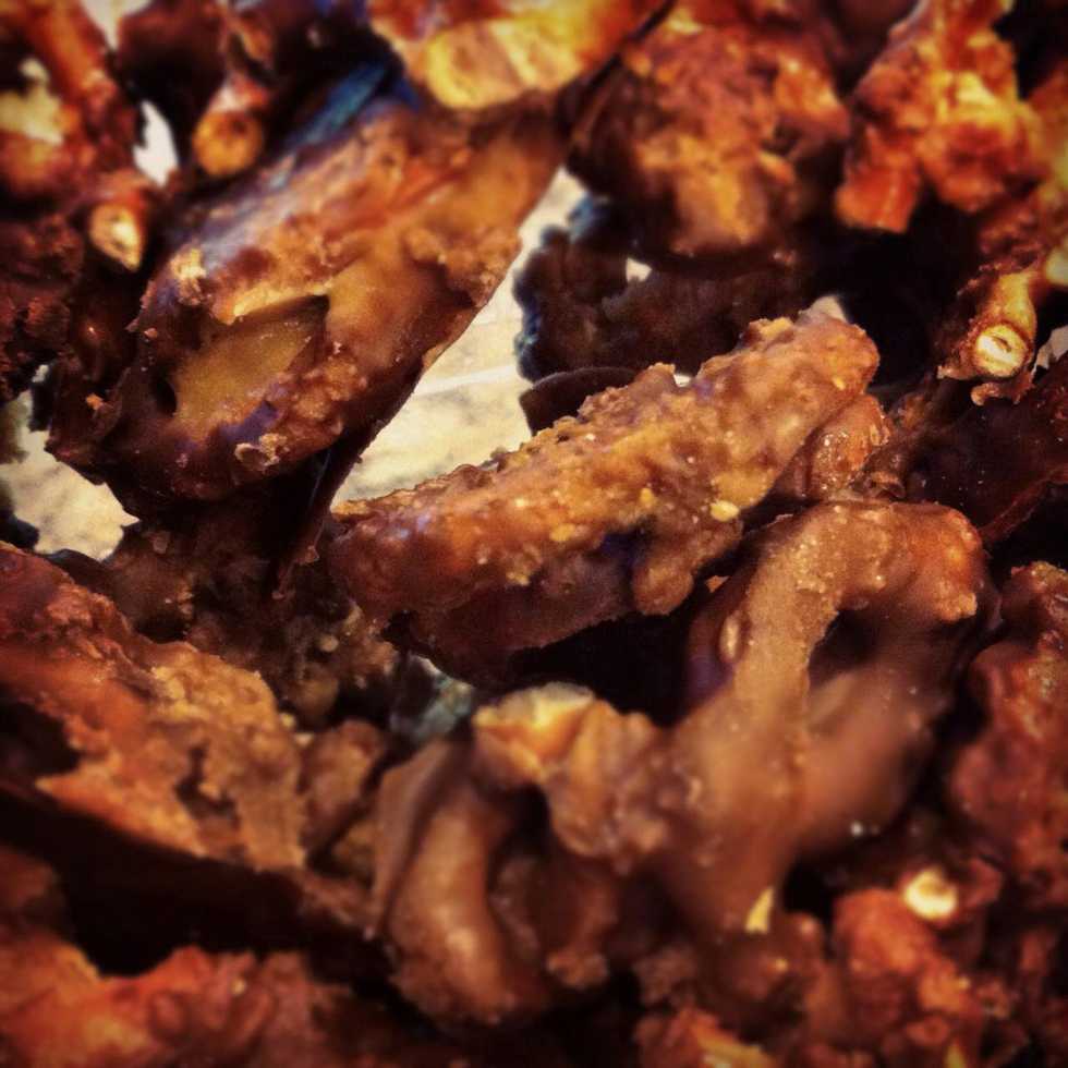 remove and turn the oven OFF. Break up Hershey bars (about 5-6 bars) and lay over pretzels. The heat from pretzels will melt the choc some, but I put this back in the OFF oven for another minute