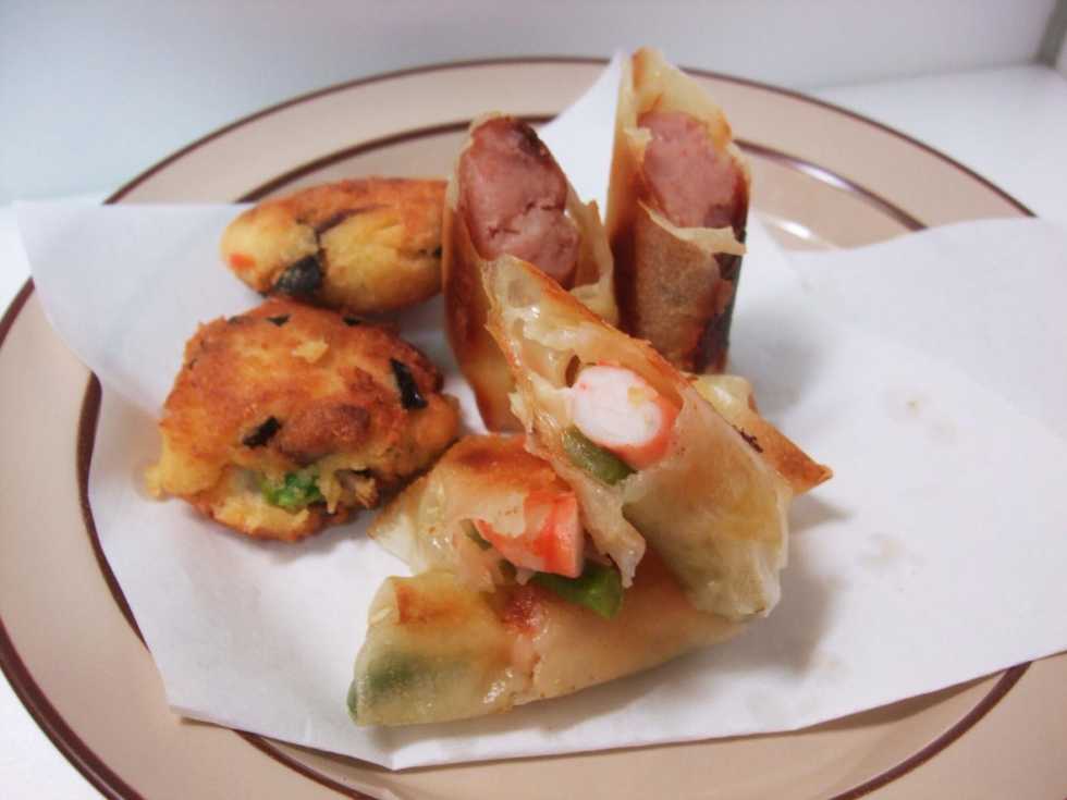 Square spring roll cut into triangles. Put sausage and chreseFolding the angleScroll upSealing the edge with a little water.You can change the ingredients with shrimp and asparagus.Deep fry in hot oil until golden.