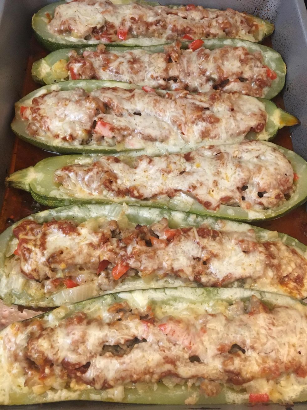 Cut zucchini in half and scoop out the insides. Save the inside to use later.