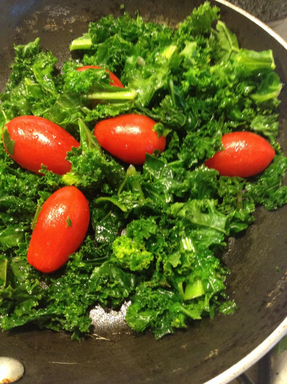 IngredientsAdd olive oil on a saucepan Then add kale Gradually add water (so kale won't stick to pan) StirAdd salt And add grape tomatoes (optional)End result (:Fast, easy, and tasty way to get your kale in! 😄