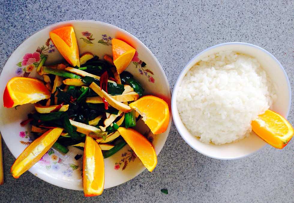 Wash leeks and dried tofu and dried red pepper, then chop them.