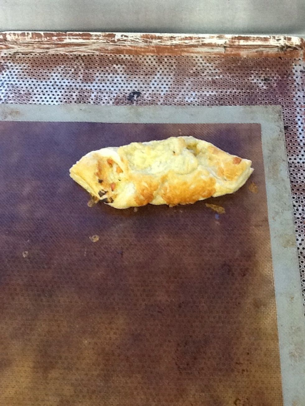 Roll out the puff pastry, 10cm x 10cm. Place the fillings on puff pastry square, the order of filling is up to you. The example has cheese on the bottom then topped with the onion and tomato.