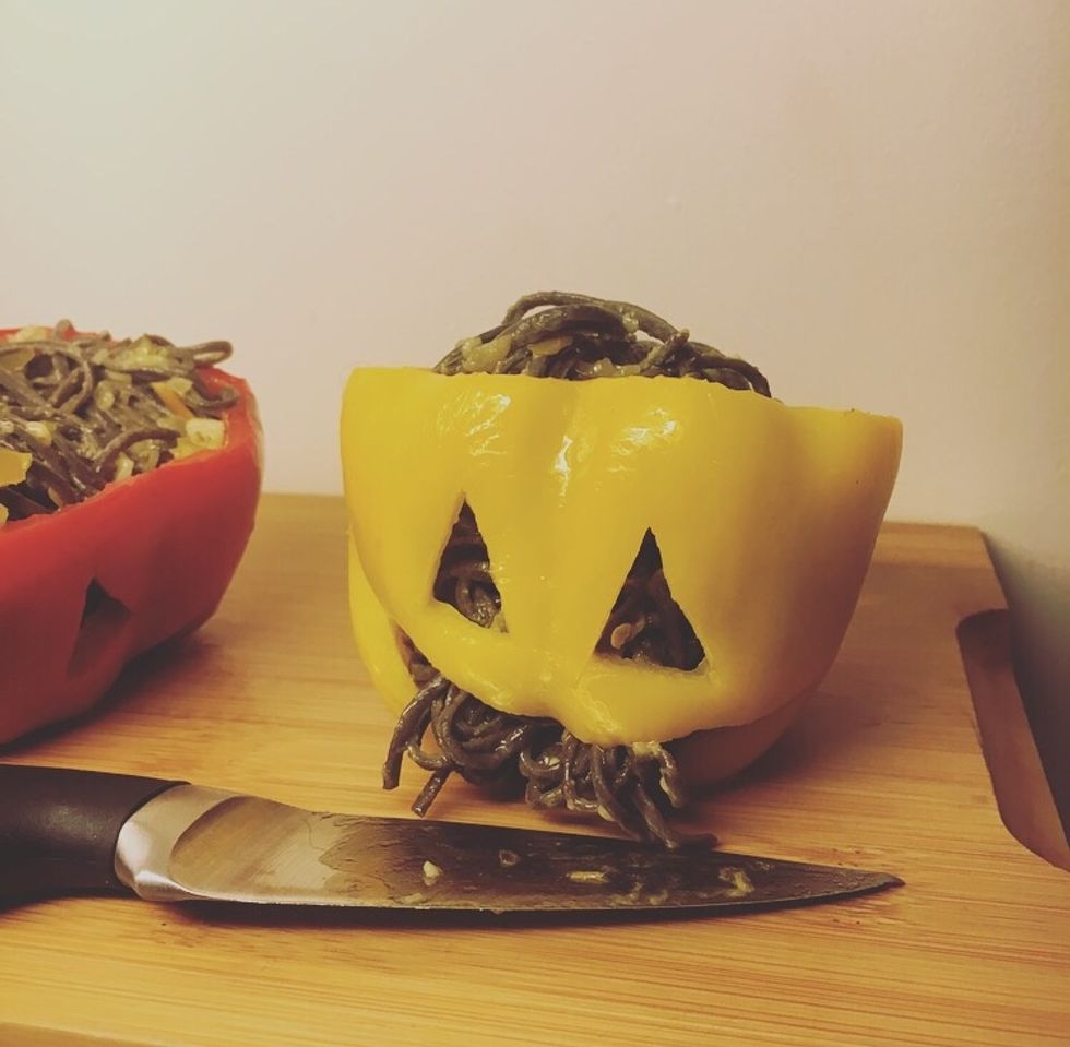 Fill the peppers with the black bean spaghetti-mix. Enjoy 🎃😋