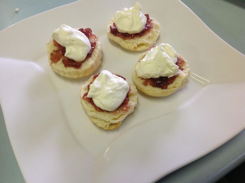 Use biscuit cutters, and cut the scone mixture and place it evenly on the baking tray, continue with the rest. Use your index finger to push the mixture out of cutter. Brush over the scones with milk.
