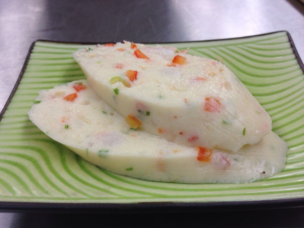 Rough chop scallops and shrimp (remove tails). Combine scallops and all but 1/4 of chopped shrimp in food processor. Add eggs, heavy cream, green onion, salt, and pepper. Process until smooth.