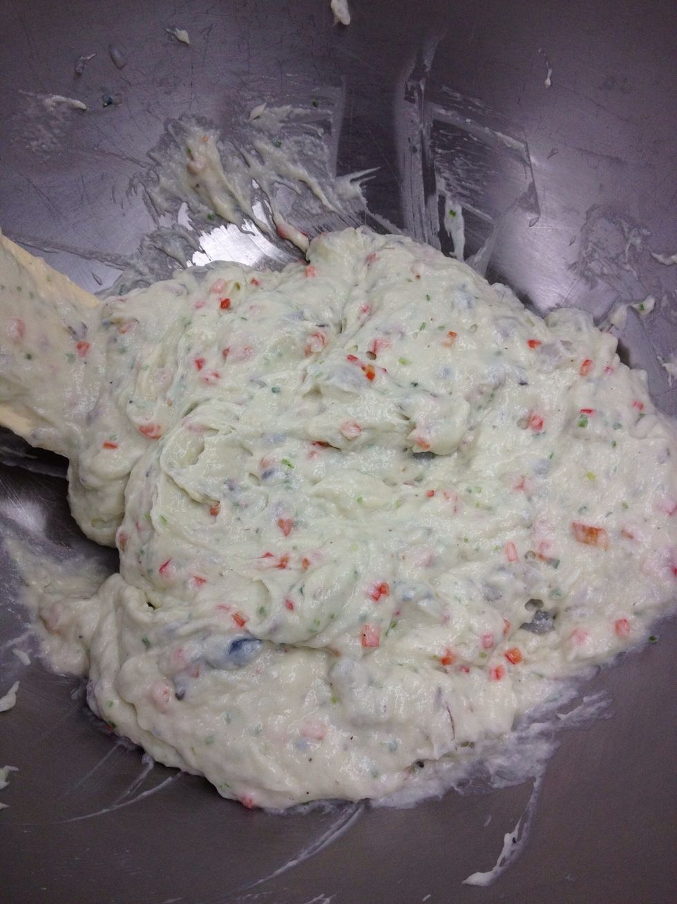 Fold remaining chopped shrimp and red pepper into the mousse.