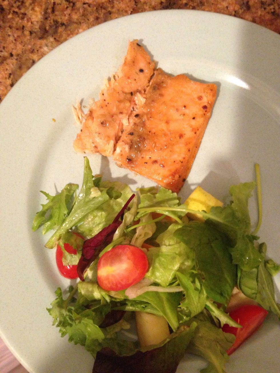 After mixing the glaze, pour over the salmon in a gallon freezer bag. Really rub the marinade into the filets. Then store in the fridge for a couple of hours.