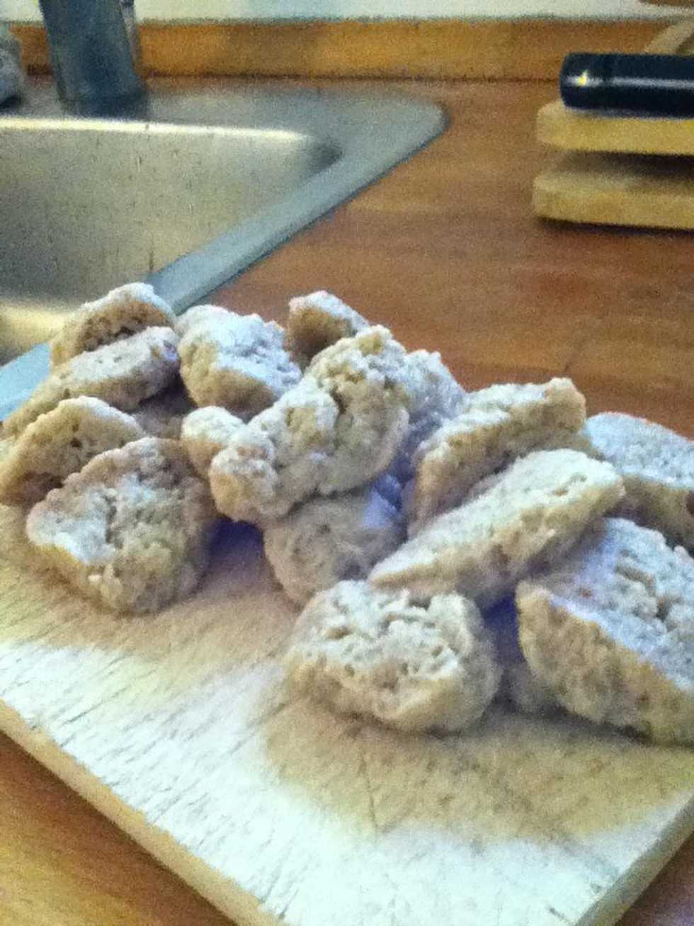 Now cut it into pieces, two large buns, or make it into a sausage (you decide) and boil it in water for halv an hour or one hour depending on size of your seitan-dough.