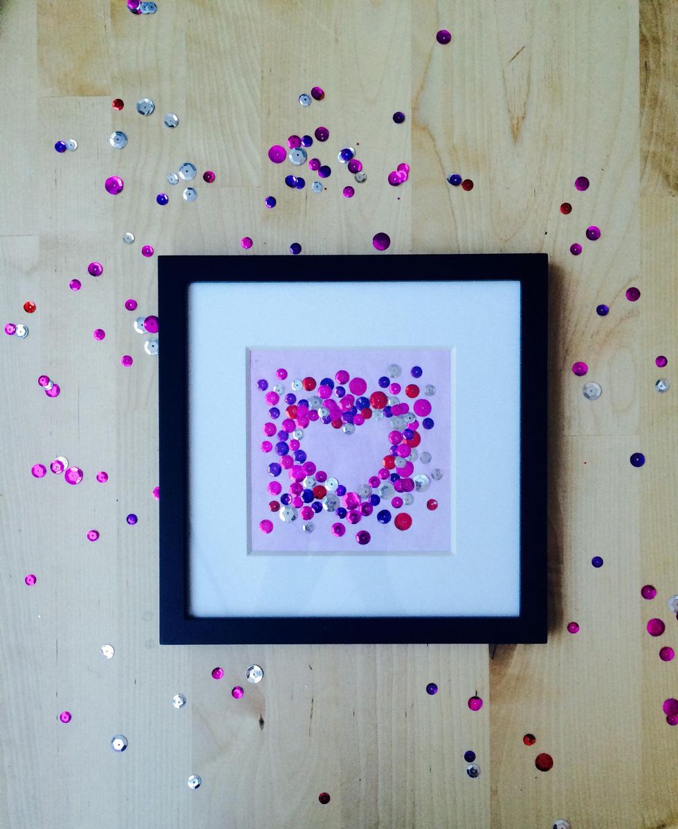 Add sequins around the outside of the heart, making them less dense toward the edge of the paper.