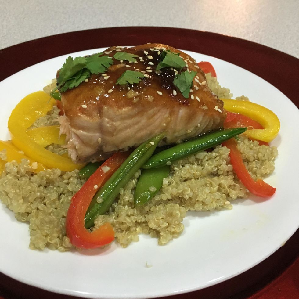 Add quinoa and vegetables onto a plate then place salmon on top. Decorate with sesame seeds and cilantro