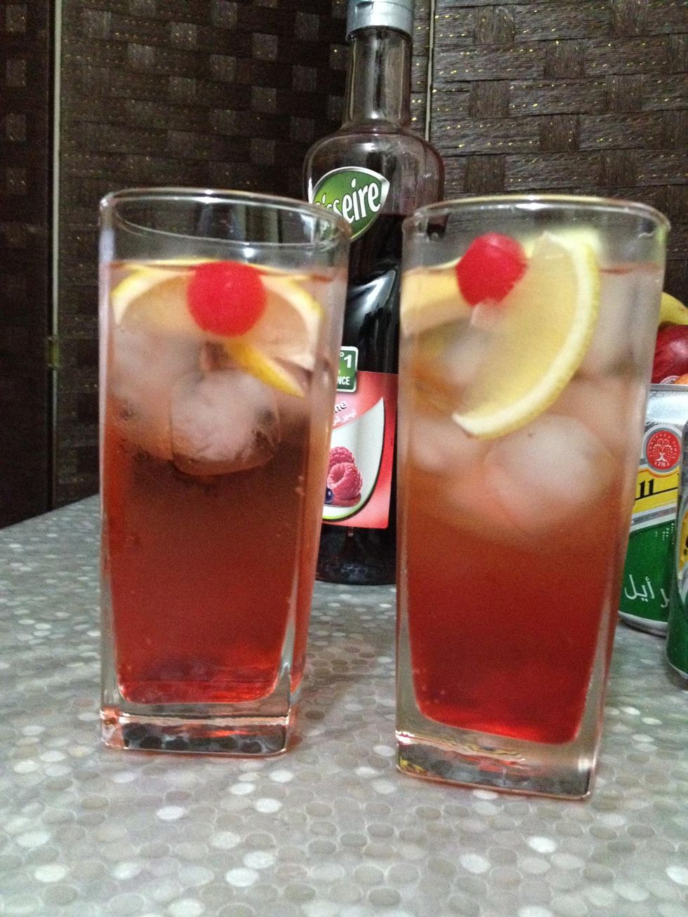 Garnish with lemon and some cherries.