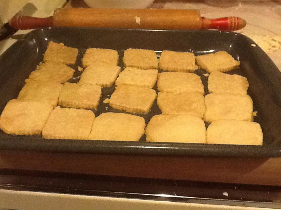Cut into any shape you like, I cut squares. It's best to make them 1/4 of an inch, but it doesn't really matter.And make sure the cookie sheet you use is ungreased.