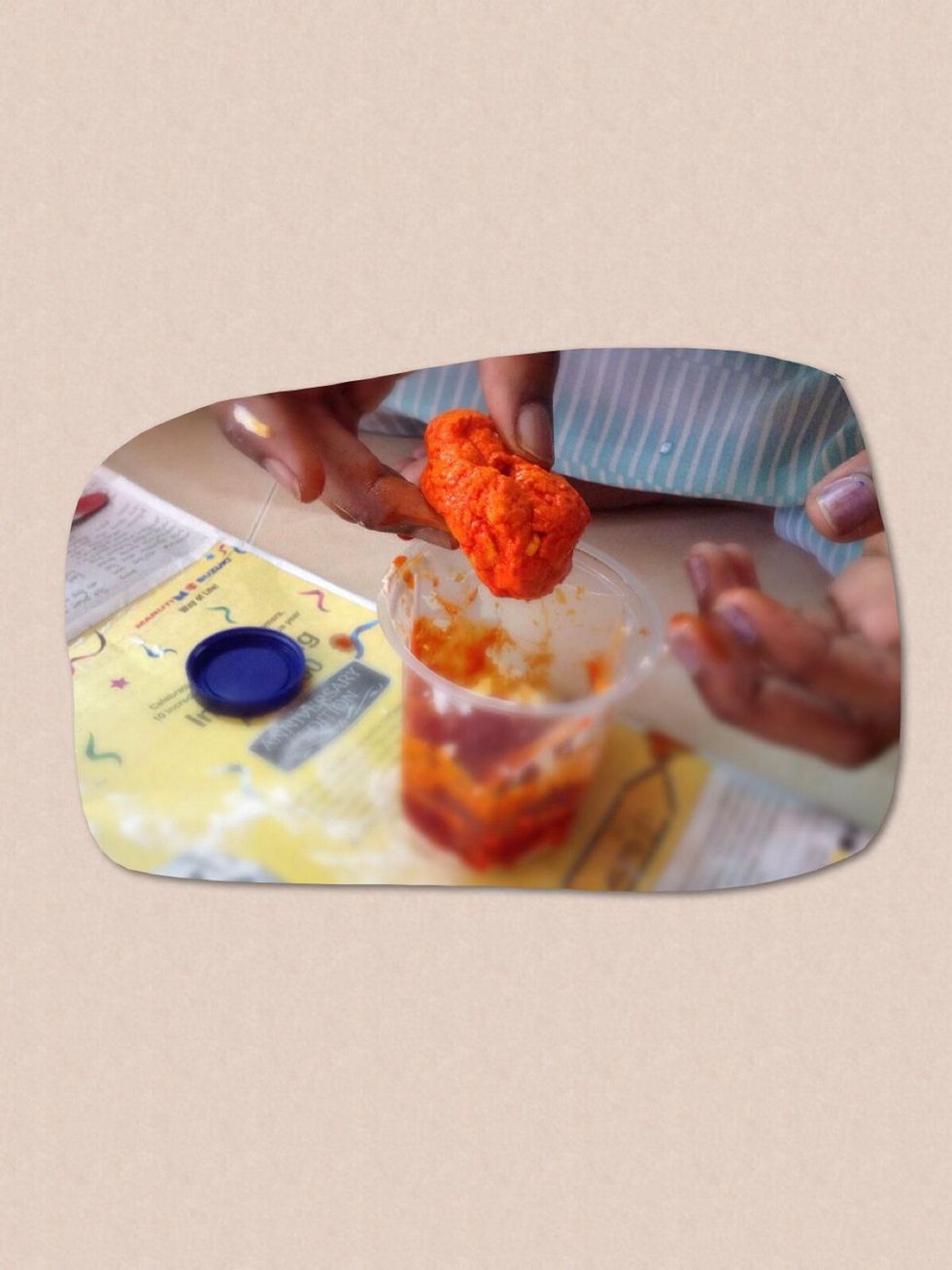 Add the borax or washing soda solution.Add some food colour to it,I chose red color