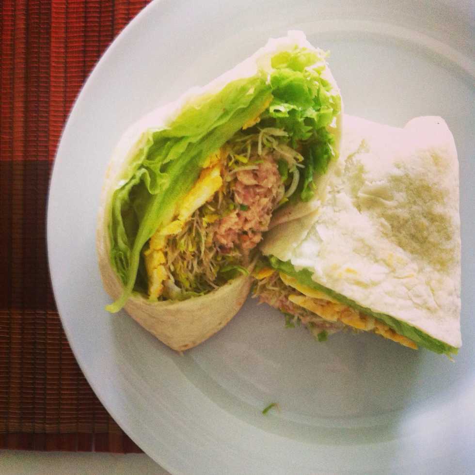 Clean vegeMake scrambled eggsHeat up wrapLettuce firstThen eggSproutsTunaFor taste, olive oil, garlic salt and black pepperFinish left over ingredients :)Fold 1Fold 2Fold 3HalfEnjoy :)