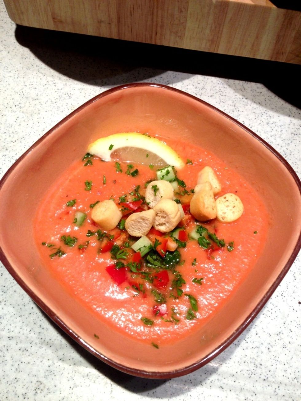 After an hour, serve the cold soup and garnish with pepper, cucumber, croutons, mint, parsley and lemon wedge. Serve immediately