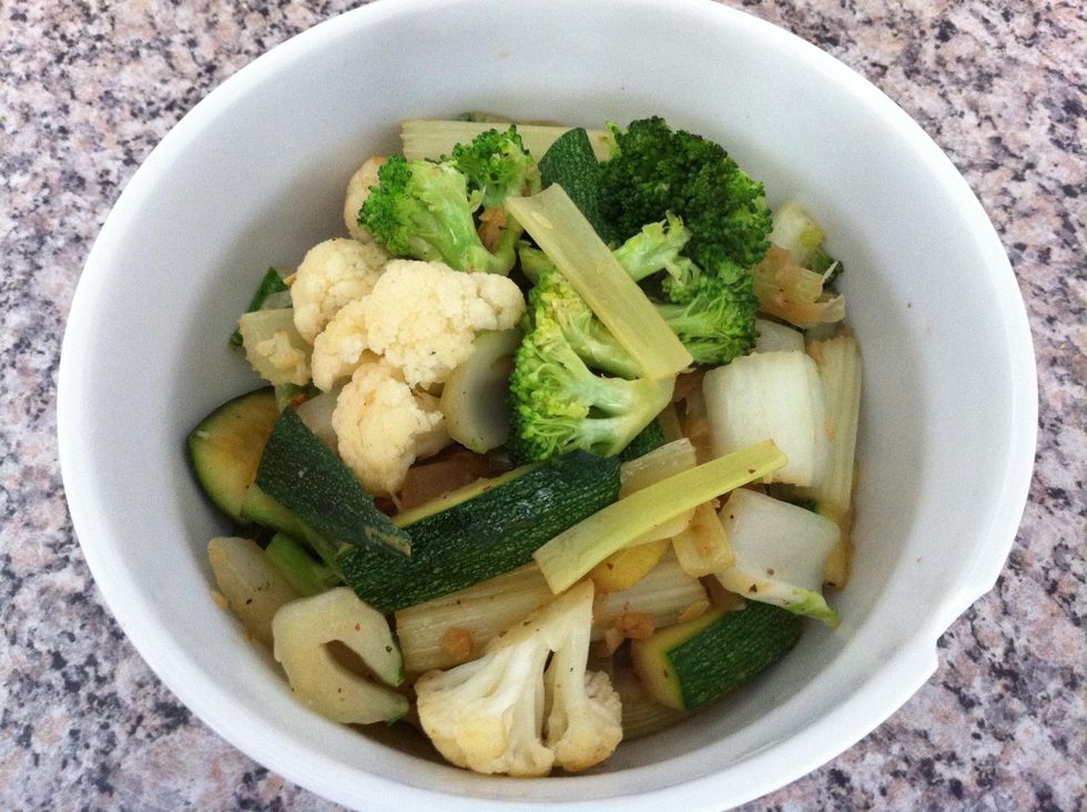 (clockwise) add veggies and stir; add pepper and sesame oil; keep stirring until veggies are getting gold brown :)