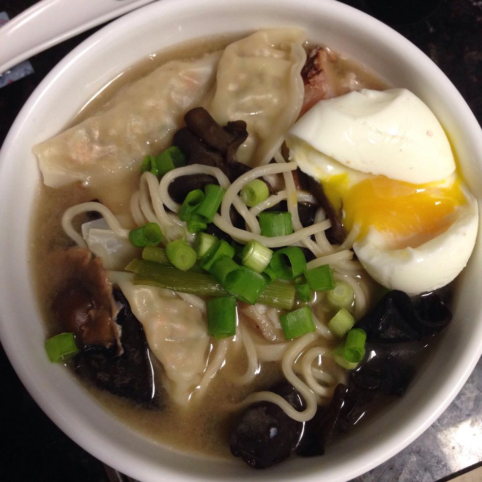 After 3 minutes or so, you can add your noodles and some green onions. I threw in some dumplings earlier because I like them. Let the noodles cook for a few more minutes.