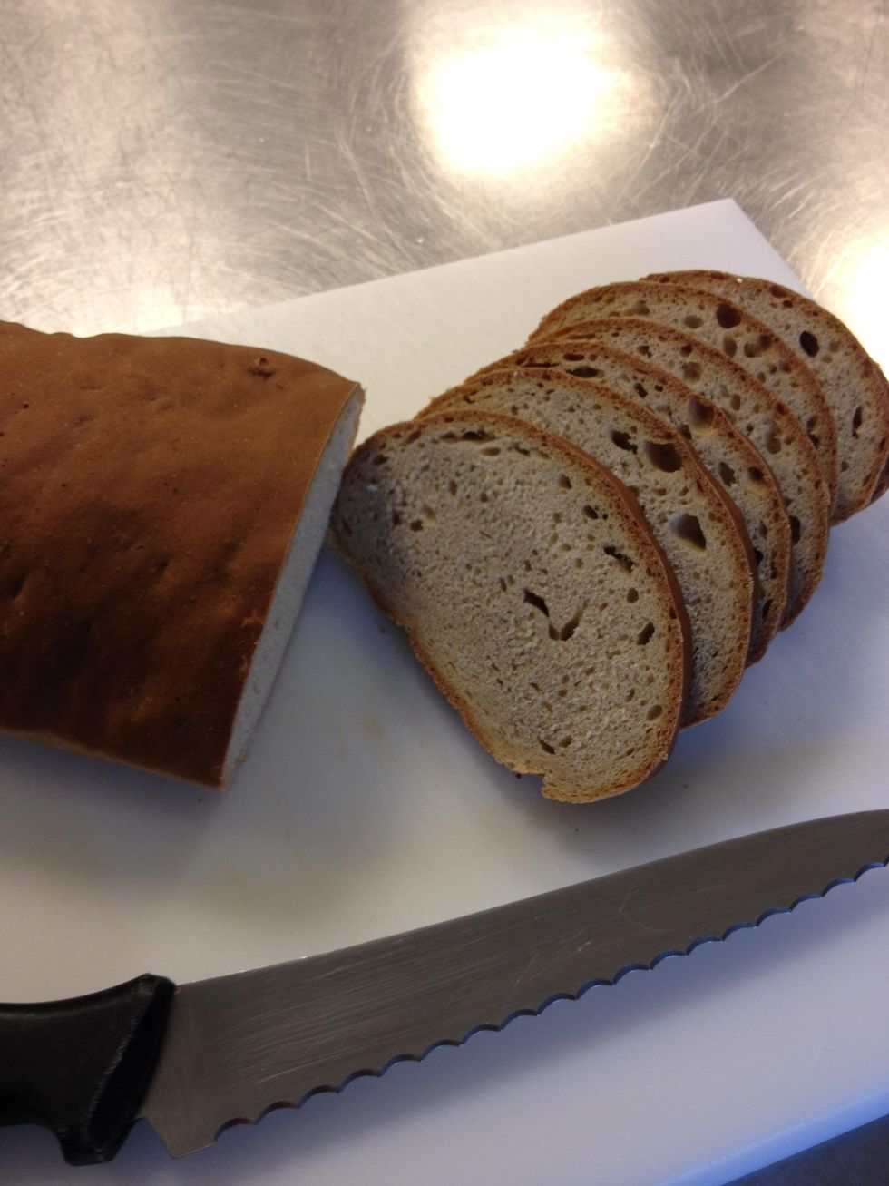 You should end up with something similar to this. Cover , if you want a soft crust, and let it rest for 30 minutes, it'll make the bread easier to cut.