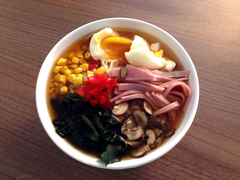 Arrange ingredients over the noodles. Cut boiled egg in half and place over noodles.