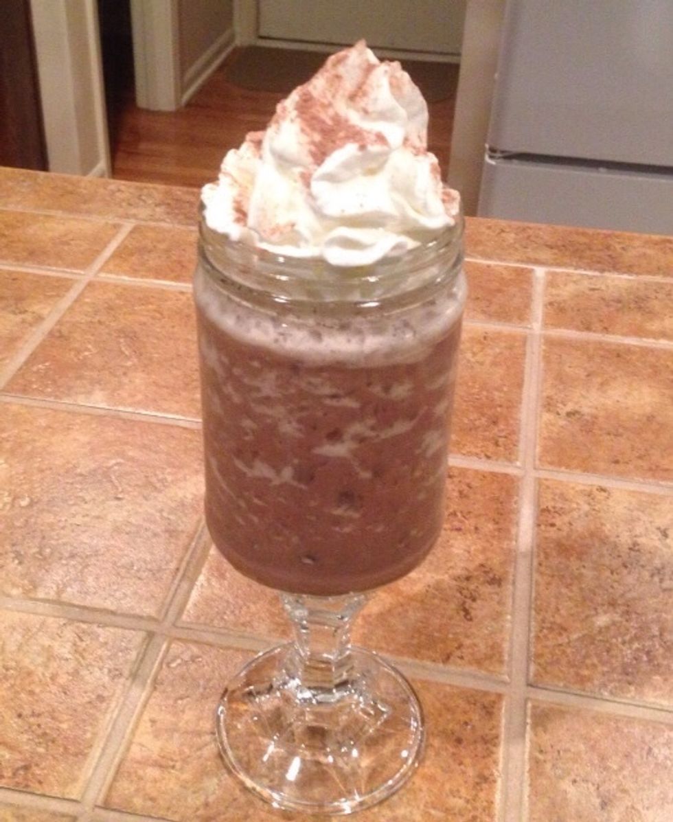 Top with cream and dust with a sweet cocoa powder and enjoy. (This is poured into the homemade red neck wine glass that you can find in my other guide.)