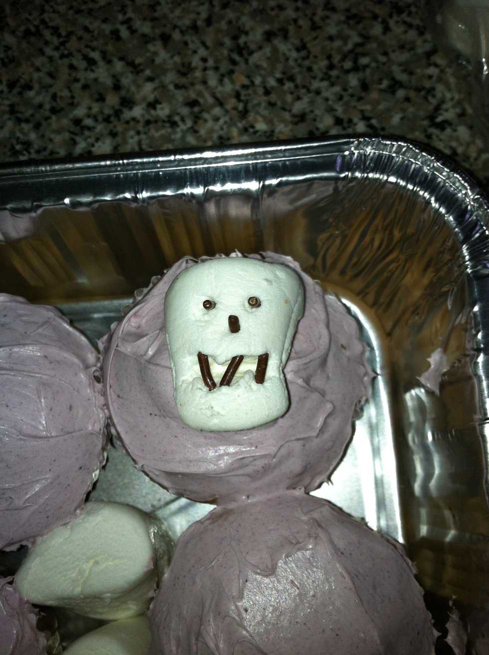Apply skull marshmallow to all cupcakes. We are finished! (The marshmallows in between are a buffer for transportation).