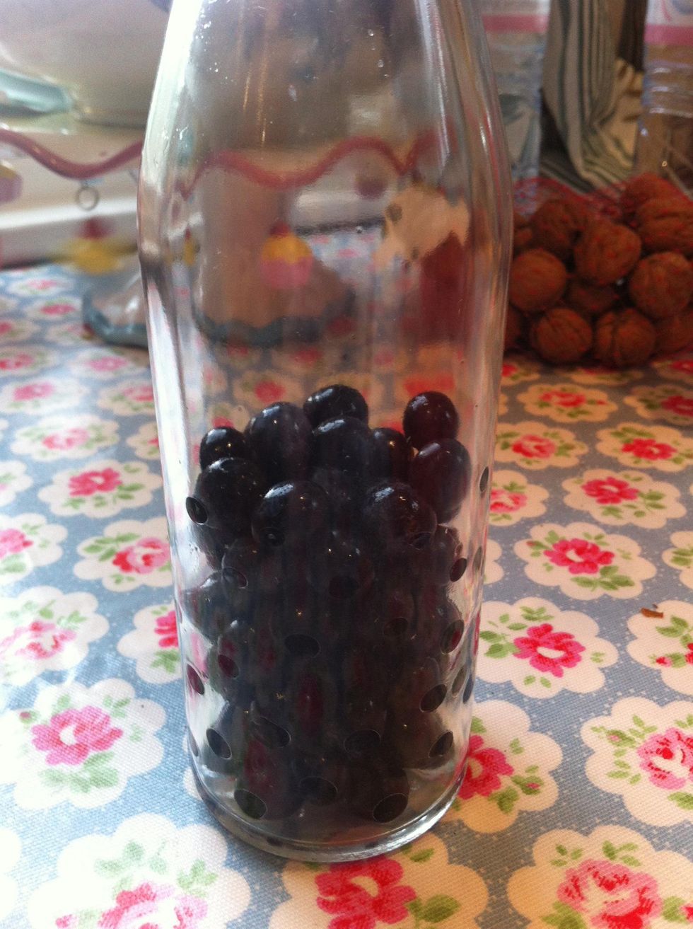Take a clean bottle - any bottle will do - and fill to about half with sloes. This isn't an exact science so don't worry if there are too many or too few.