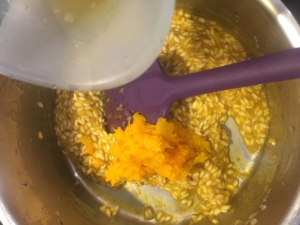 When rice is still al dente and has a very loose consistency, add most of the grated Parmesan cheese