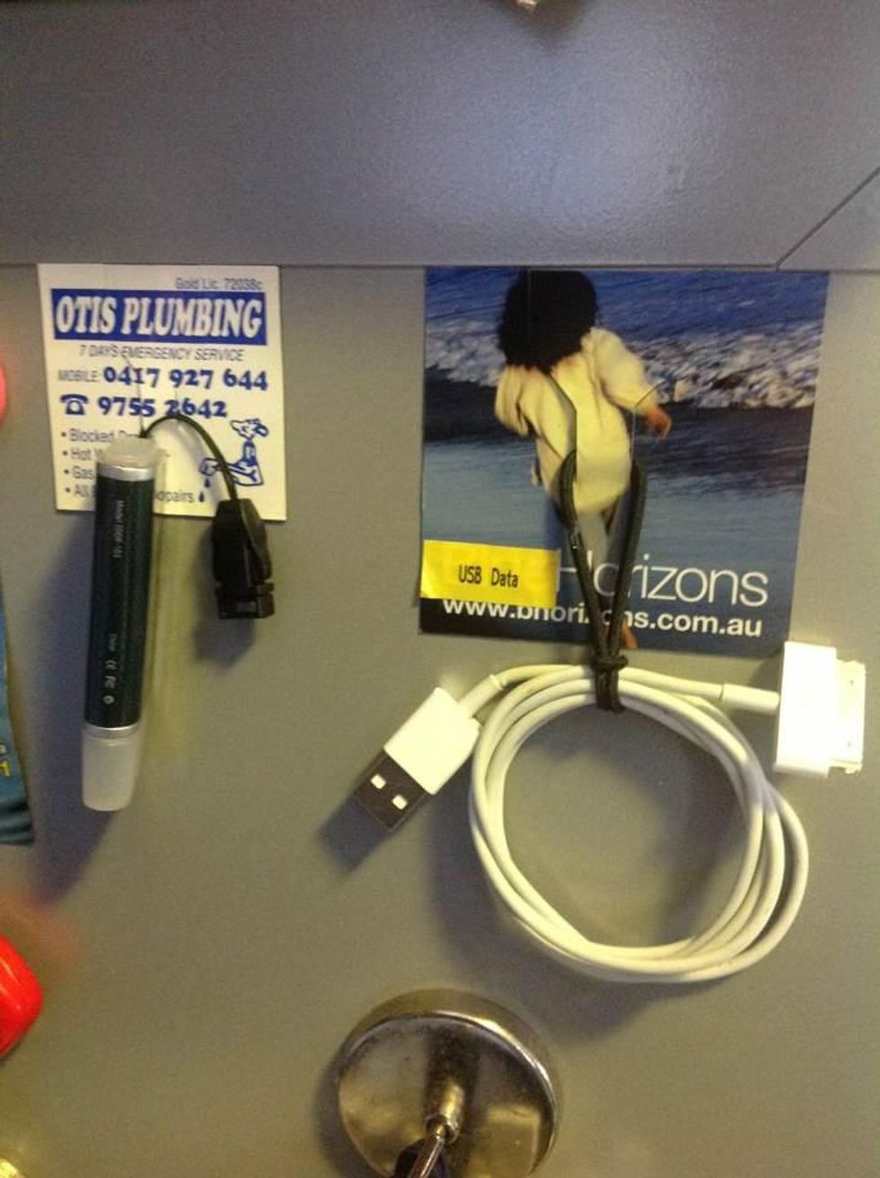 2. DON'T cut across the bottom of the hook. Open the hook, loop item (say cable grip :-) over hook, place magnet on ferrous surface ensuring the 3 top edges are butted together. Bad sketch ;-}