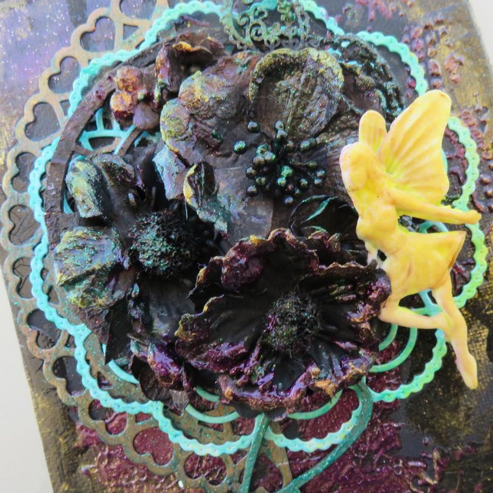 Glue the clay fairy over the flowers cluster as shown. Add Vegas Gold paint over the cracks made with crackle glaze during the previous step and are dry now.