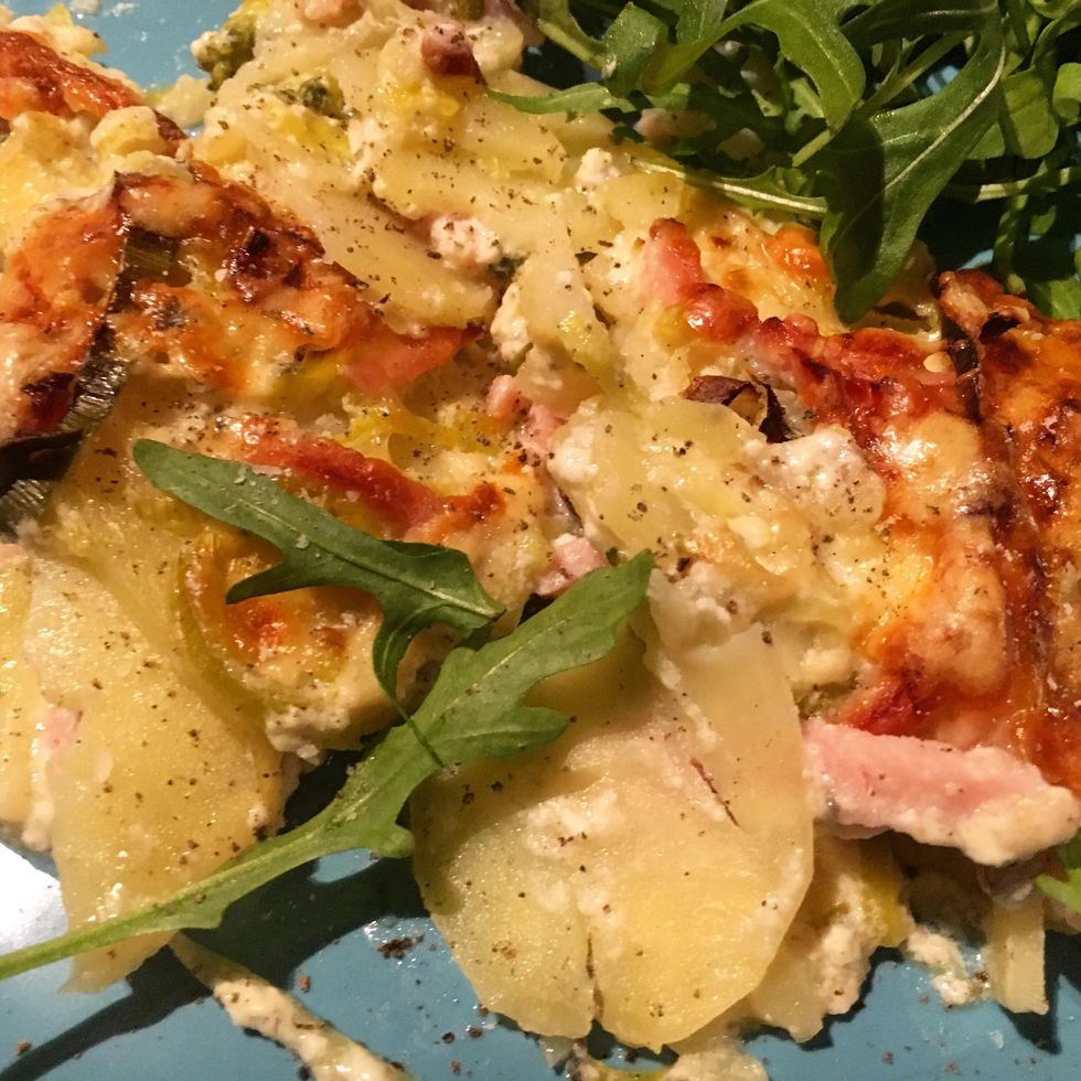 Put the potatoes and leek in layers in a buttered pan. Season with salt and black pepper.