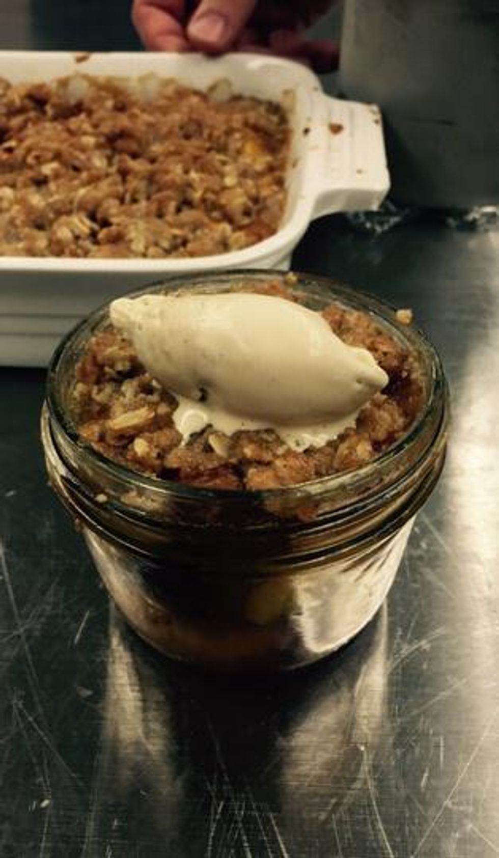 Create topping using butter, rolled oats, brown sugar and desired seasonings.
