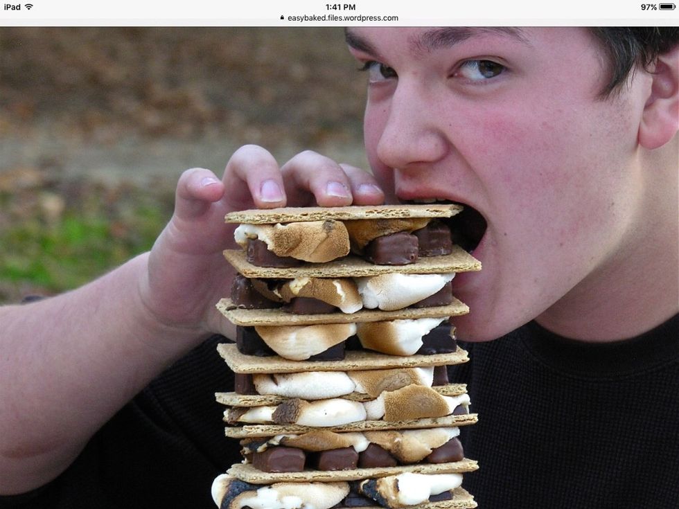 Then you get marshmallows then roast then wait until it's crispy then put it on the chocolate