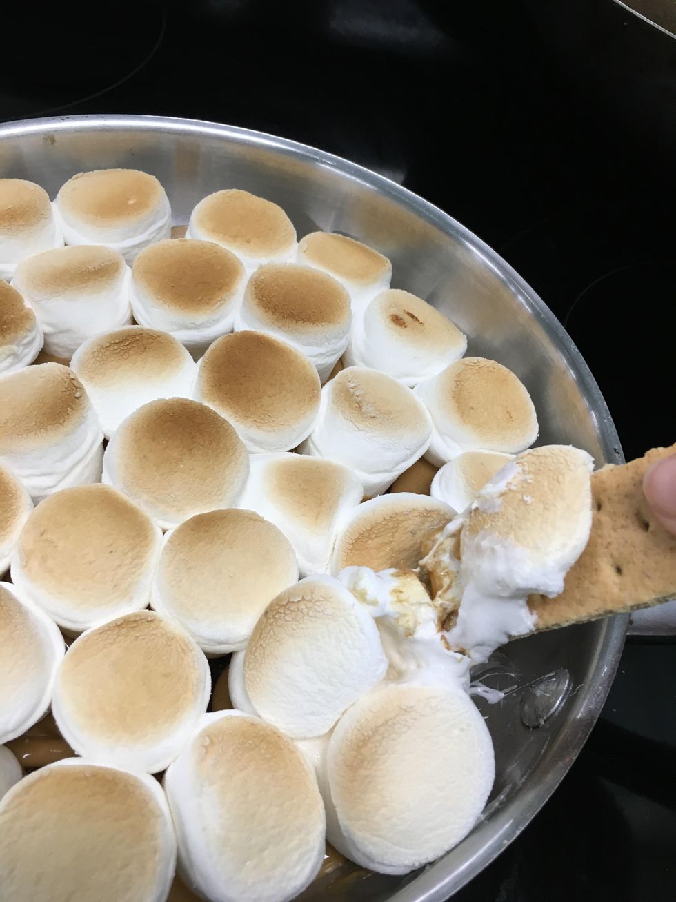 When the marshmallows are all golden brown, serve in the frying pan. Eat with your graham cracker pieces.