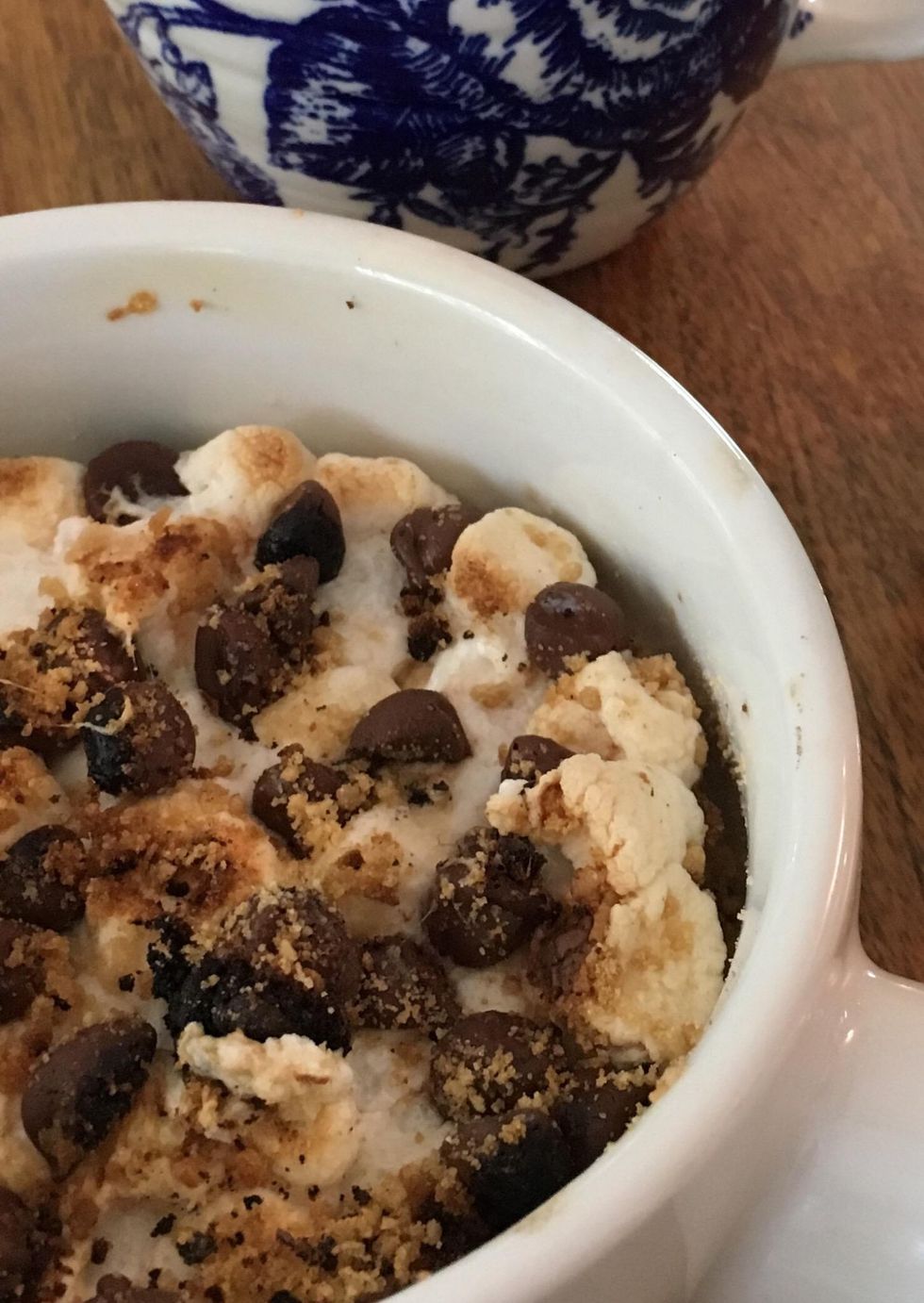 Using an oven safe bowl, pour in the crushed graham crackers until the bottom is covered evenly. (Gluten free folks: just use gluten free s'mooreables crackers!)