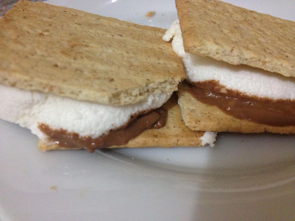 Graham crakerTop graham craker square with chocolateAnd marshmallowMicrowave on high 15-20 seconds or until chocolate and marshmallow begin to melt and cover each s'more with another graham craker squareEnjoy !