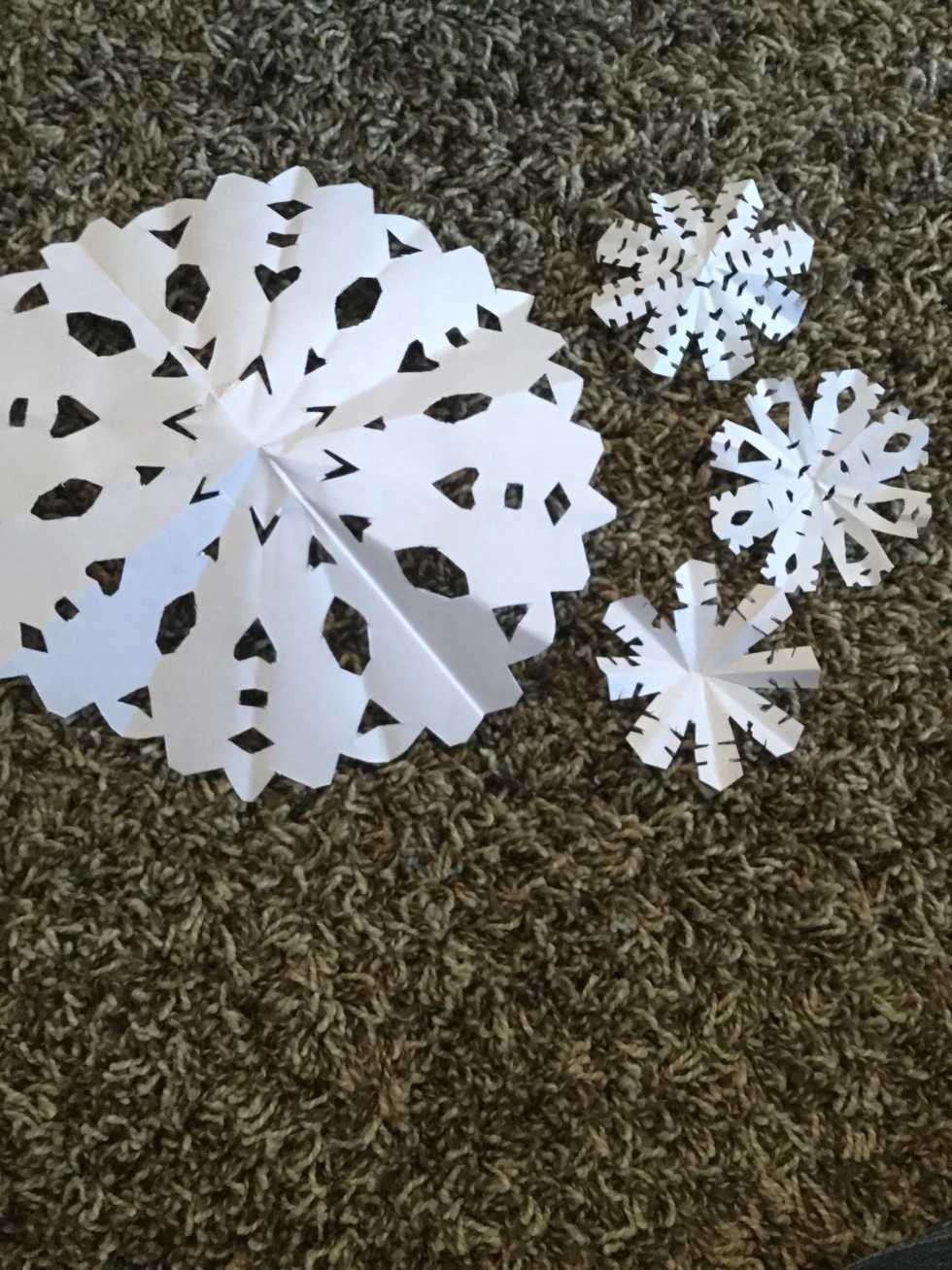 Cut pieces and designs into the "cone". I like to put my clippings on a piece of paper so that I don't have tiny paper in the carpet. (BTW, I made 3 snowflakes-one big and three small-).