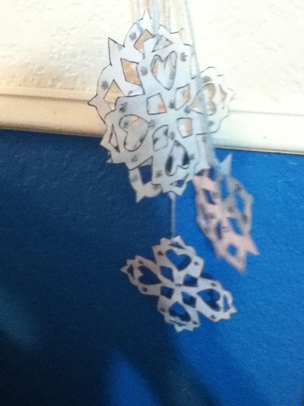 Cut a decent length of string. Cut them different lengths for each snowflake.