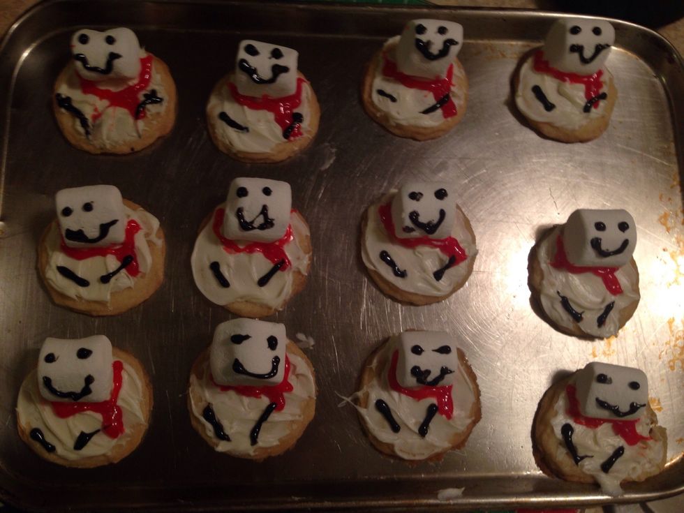 You will need sugar cookie dough, vanilla frosting, red gel, black gel, pan, and a bag of marshmallows